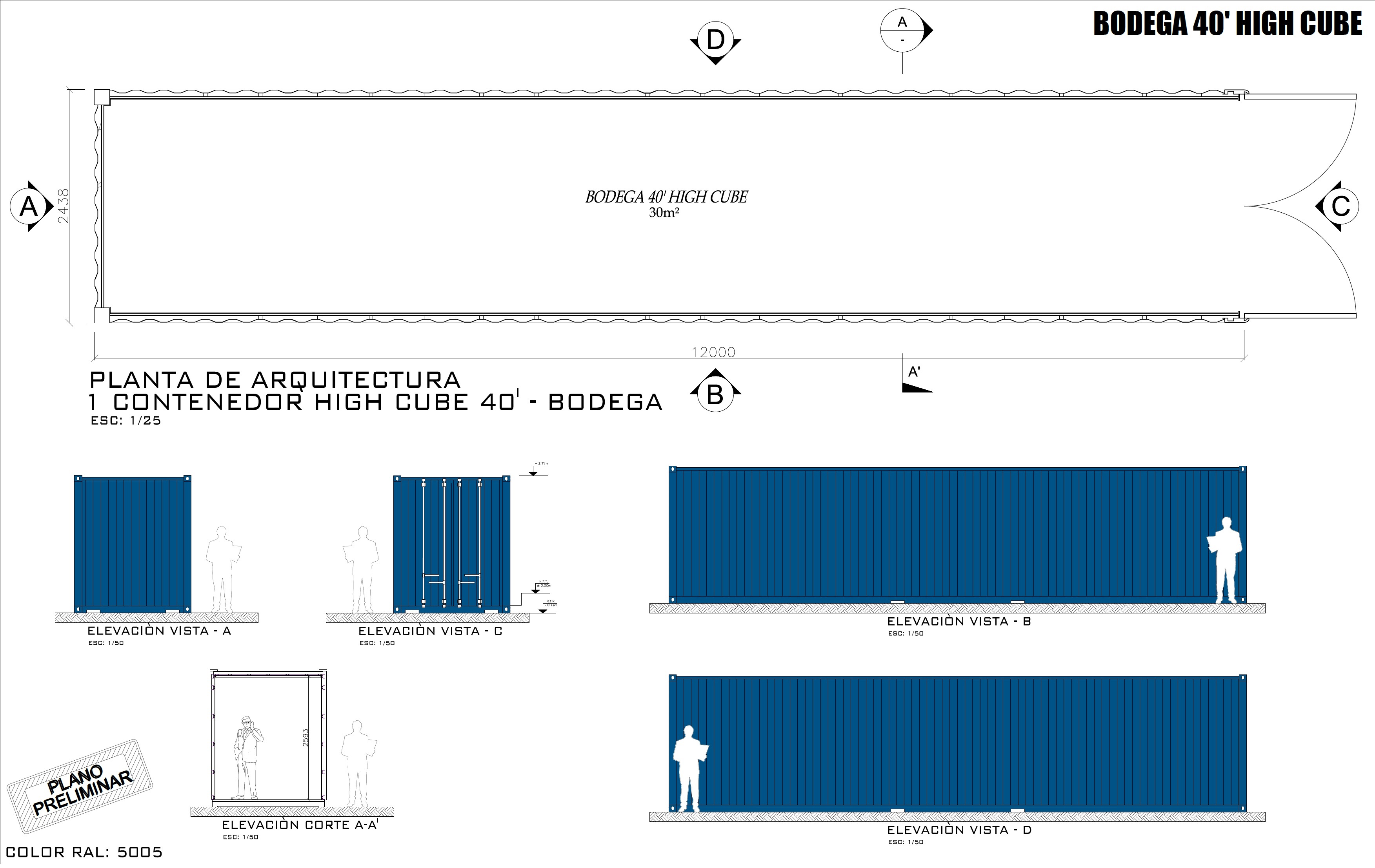 Bodega desarrollada en base a contenedor marítimo original de 40 pies de alto High Cube, posee una estructura en base a perfiles de acero, según normativa ISO-668, unido mediante soldadura MIG, muros de planchas plegadas de acero corten de 2,3 [mm] con la pintura original del contenedor.
